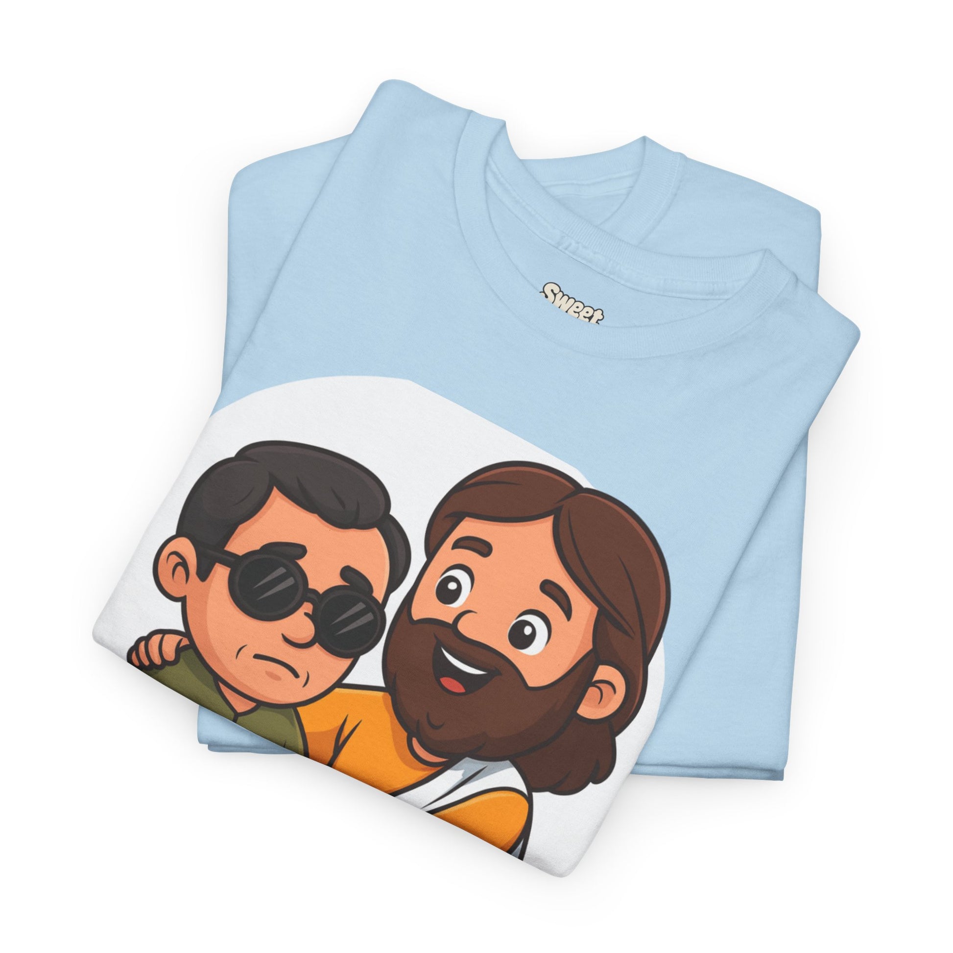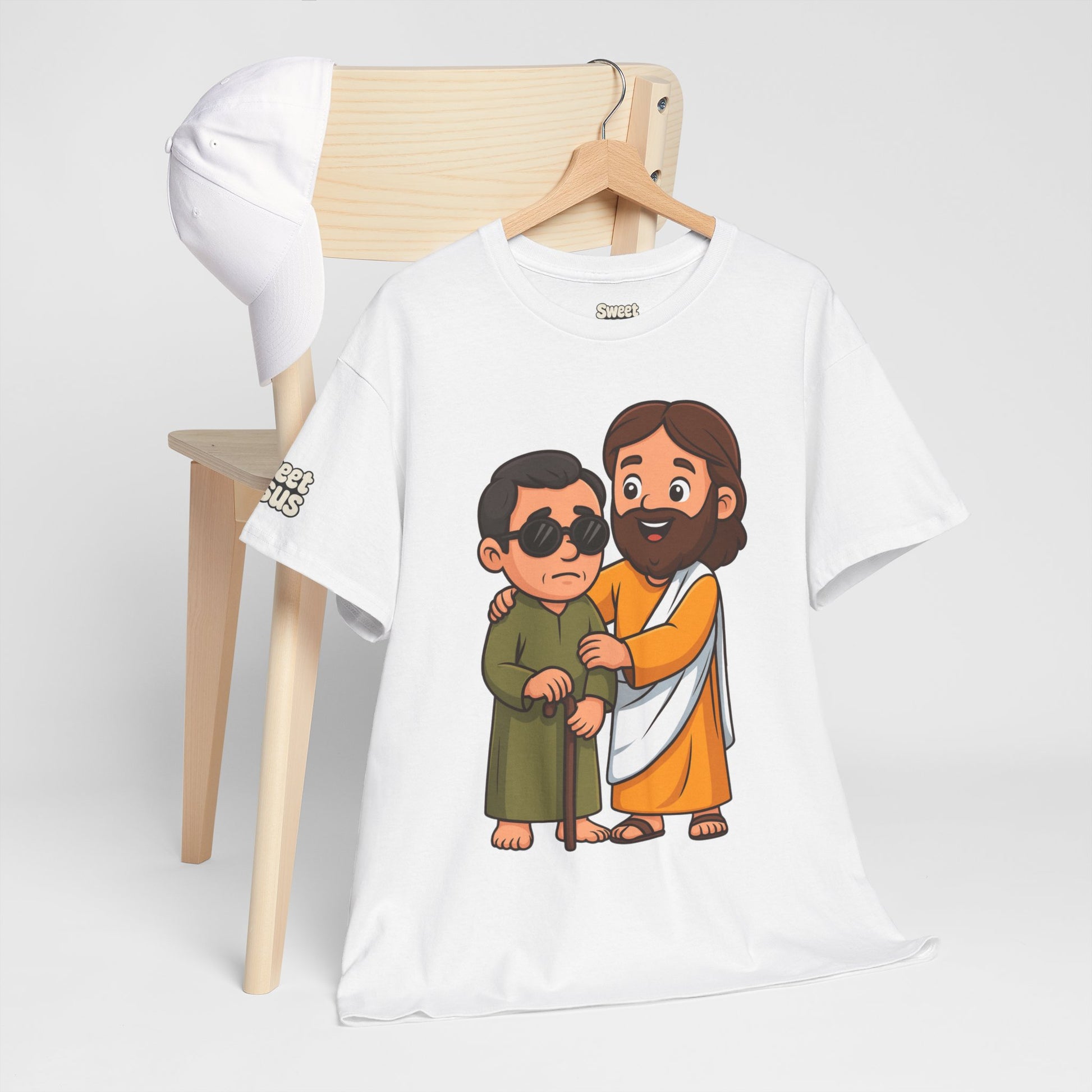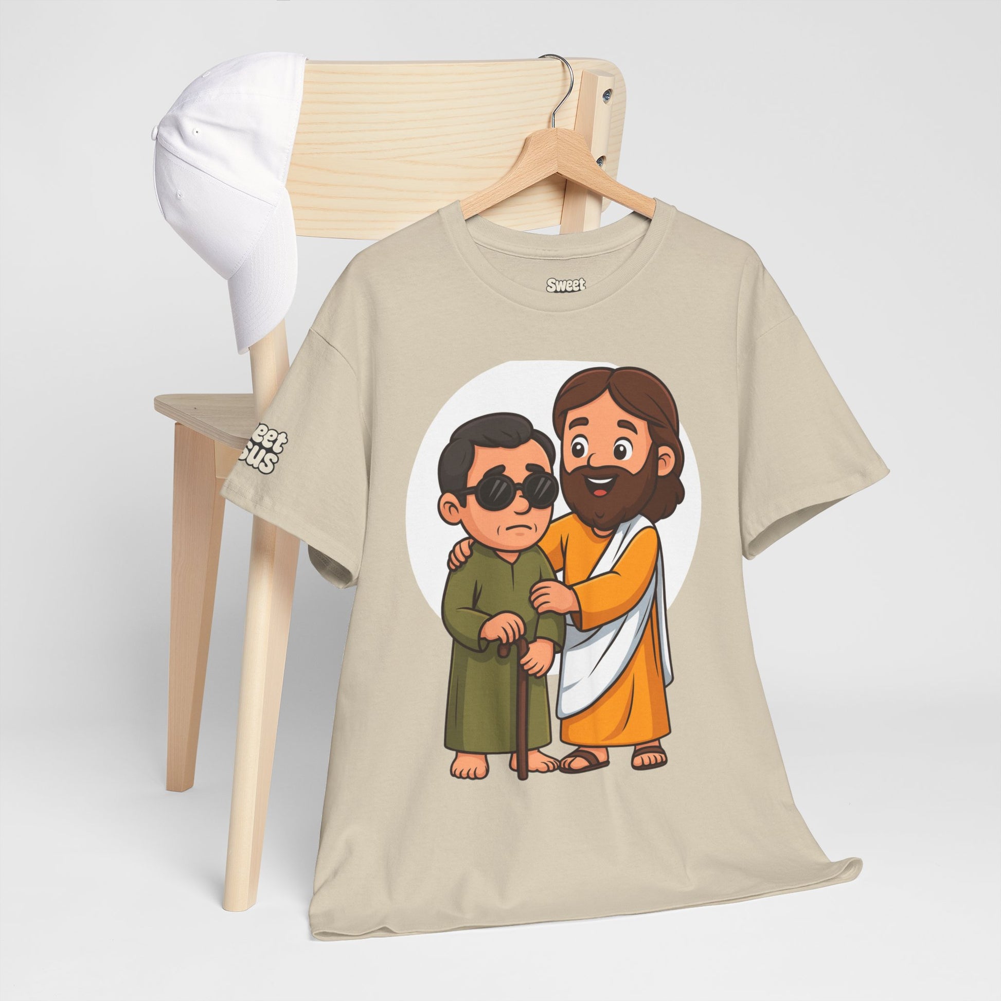 Share a story without saying a word. This Sweet Jesus tee features our signature character in a tender moment — gently guiding and healing a blind man. It’s a warm, lighthearted take on one of the most powerful miracles in Scripture, brought to life in the playful Sweet Jesus style.